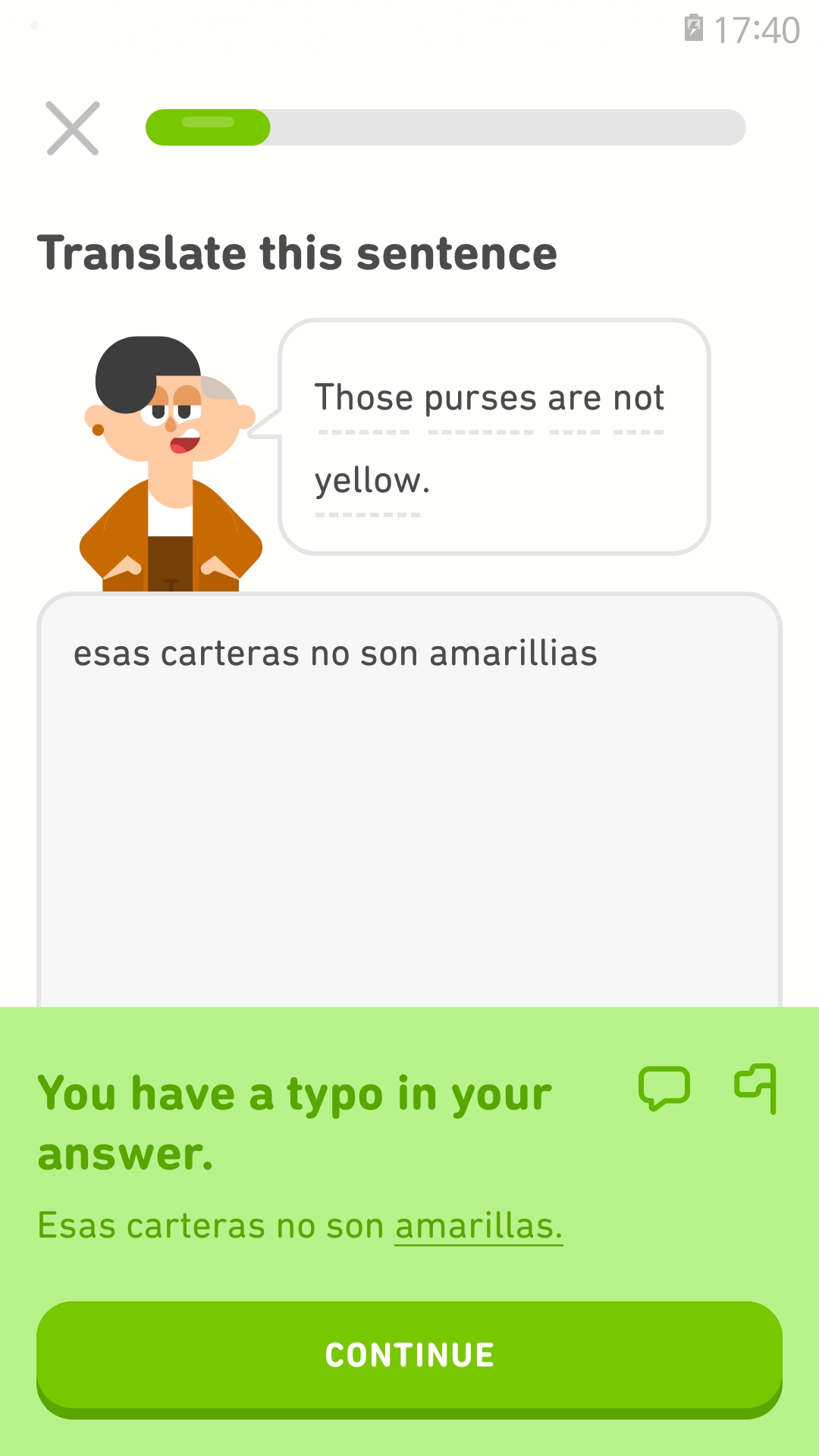 이게 좀 큰 단점인데, 게다가 듀오링고에서 원하는!!!!!!! 영어식 표현!!!!! 영어식 해석!!!!!이 딱 정해져있기 때문에 골치 아플 때가 있습니다. 분명 맞는 표현인데 듀오링고 컴퓨터가 원하는 답이 아닐 때 틀렸다고 하면 더 답답하죠.