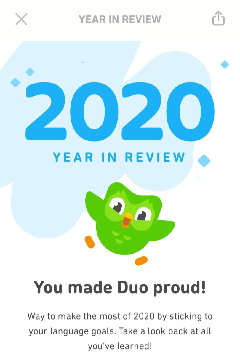 그리고 얼마 전 듀오링고를 하러 들어갔는데 두둥! <2020년 리뷰(Year in Review)> 팝업이 뜨길래 냉큼 눌러보았습니다!