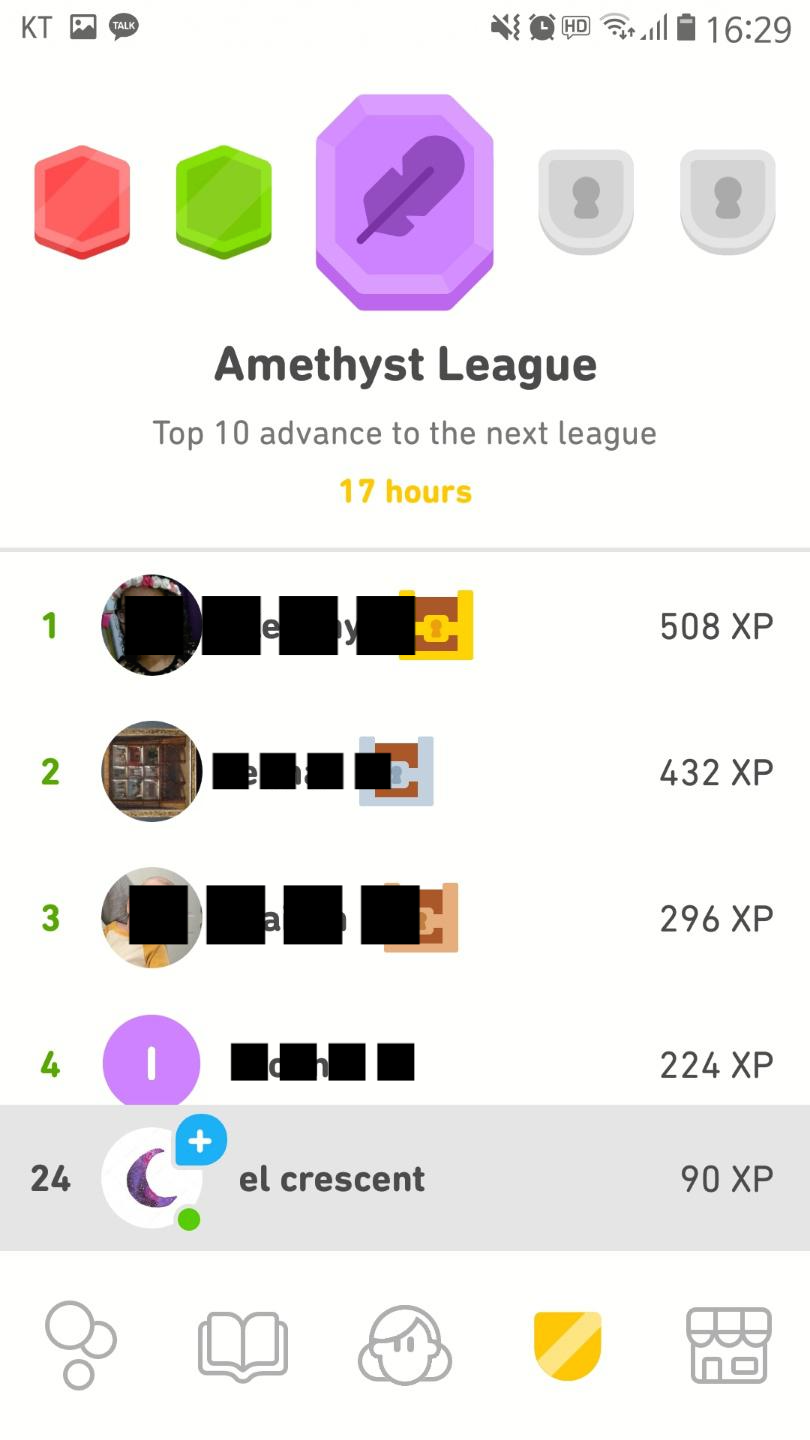 듀오링고에는 매주 월요일에 시작하는 "리그"가 있습니다! 각 리그별로 매주 순위를 매기는 시스템이에요.