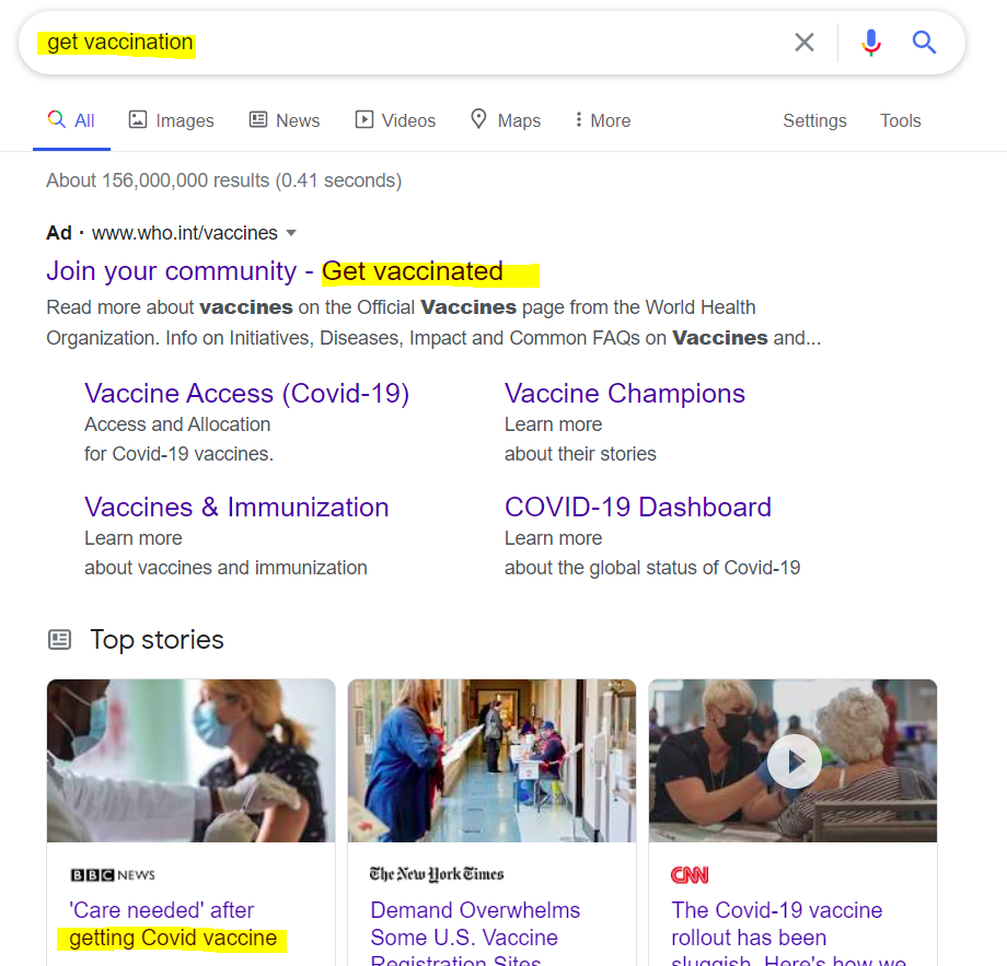 그럼 백신을 맞다는 뭘까요? 우리나라 식으로 번역을 하면 백신 접종을 받는 것이라서 Get vaccination으로 생각할 수 있는데요. 아닙니다! Get vaccination을 검색하면 다음과 같이 나오는걸 보실 수 있습니다.