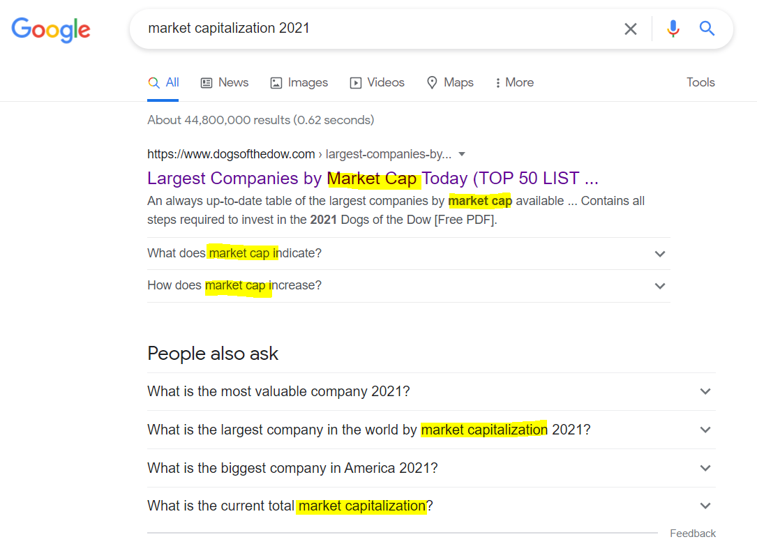 구글에서 market capitalization 2021을 쳐보면 지금 가장 시가총액이 높은 회사를 확인할 수 있습니다.