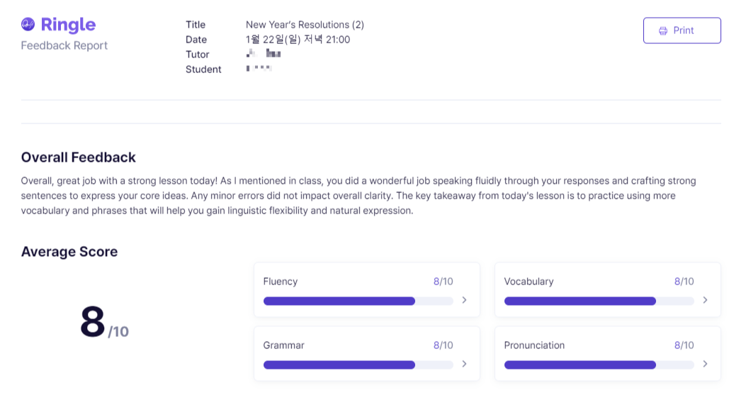 1월 말과 7월 초에 같은 선생님과 수업한 후 받은 피드백 리포트를 가져왔습니다! 6개월간 제 점수는 8점에서 8점 후반대로 상승했는데요.