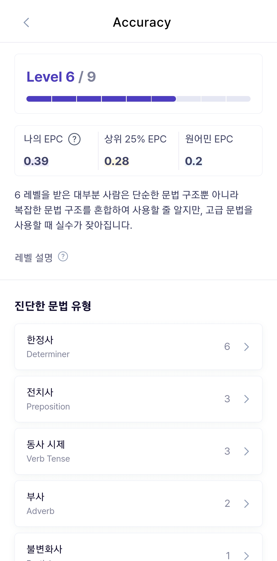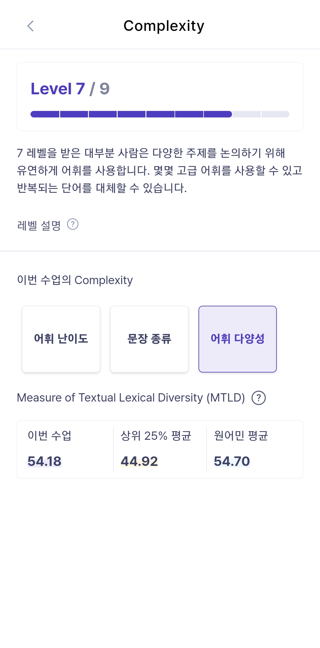 단순 측정에서 나아가 구체적으로 어떤 부분을 교정해야하는지도 알려줘서 너무 도움이 많이 되는 좋은 진단!!!! 저는 Complexity(복잡성)이 많이 떨어져서 고급어휘를 쓰려고 의식적으로 노력하다보니 레벨이 7까지로 많이 늘었답니다.