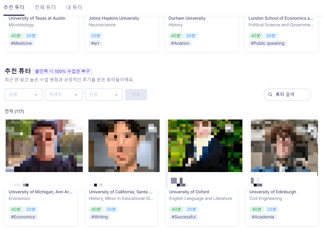 제가 다양한 선생님과 하는게 덜 부담(?)스럽기도 했고요, 사실 서로 시간을 맞추는 게 조금 어렵습니다. 그렇지만 링글이 아이비리그 출신의 선생님들로 홍보를 하고 있는 만큼 선생님들의 수준이 기본적으로 굉장히! 높은 편이라 새로운 선생님과 해도 항상 만족스러웠어요. 저는 저랑 스타일이 달랐던 쌤 2-3분 빼고는 다 찜한 튜터 목록에 저장을 해두었습니다ㅎㅎㅎ