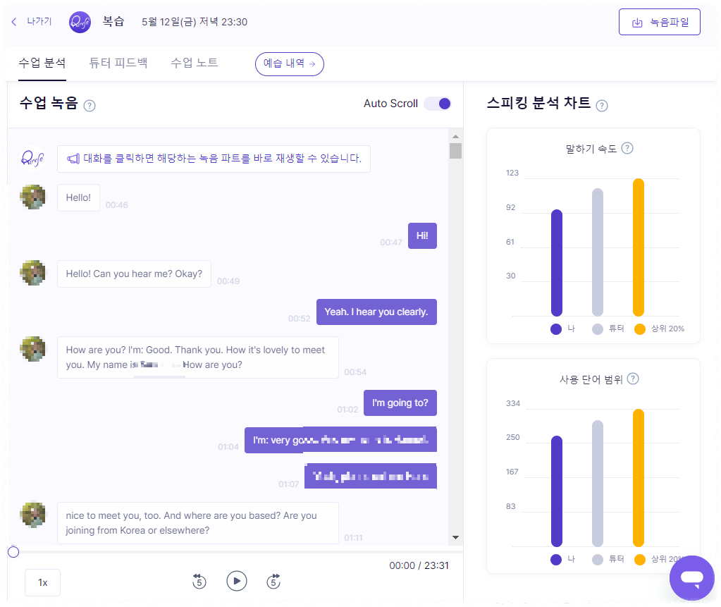 수업분석은 제 수업을 녹음하여 파일과 스크립트를 제공해주고 있습니다. 완벽하지는 않지만 거의 제대로 인식하는 편이더라고요. 우측에서 제 말하기 속도, 사용 단어와 필라워드(음.. well... 같은것)를 분석해주고 있습니다.