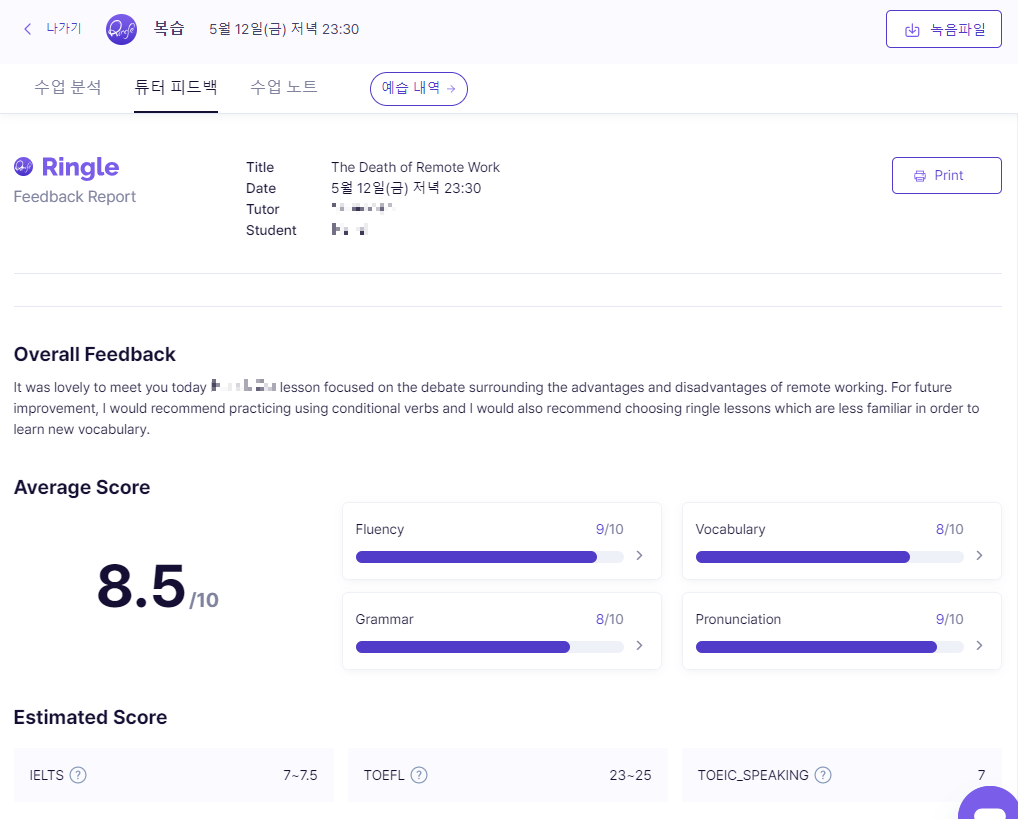 수업에서 어떤 퍼포먼스를 보였는지 확인하고 모자란 부분을 계속해서 개선해나가는 것이 실력 향상의 지름길인데요. 링글에서는 AI 기술 등을 적용해서 제 수업을 바로 분석해주고 피드백해주어서 너무너무 좋습니다!