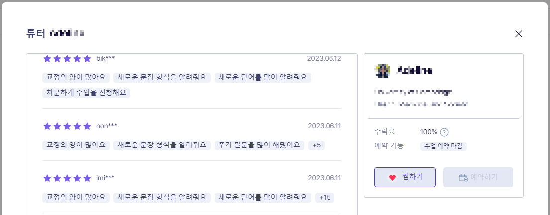 저 같은 경우에는, 차분하고, 대화를 많이 할 수 있고, 교정을 잘 해주시는 선생님이 좋았는데요. 각 선생님들의 자기소개 페이지를 보시면 수강자들의 평가가 어떤지 볼 수 있습니다. 제가 제일 좋아하는 선생님은 이렇게 받은 수강자들의 평가가 제가 원하던 조건과 일치해서 듣게 된 선생님이었습니다! 그리고 이후 9번이나 수업을 함께 하게 되었답니다!