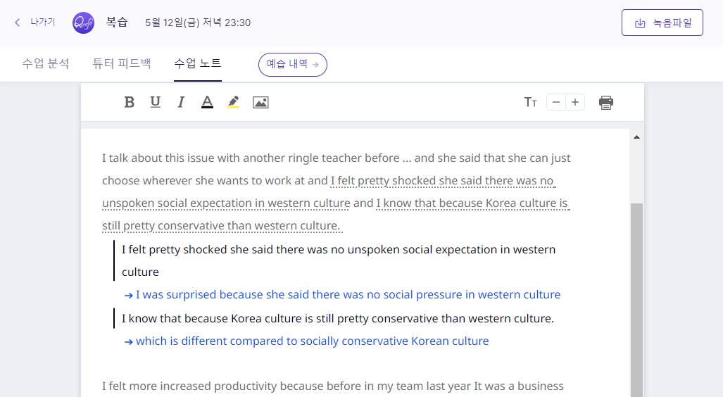수업이 끝난 후 튜터 분이 제 전반적인 실력에 대해 평가해주시는 튜터 피드백 코너입니다. 보통 수업시간 중에 말해주신 내용과 비슷한 편입니다! 캡처에는 없지만 하단에 In-depth feedback을 해주셔서 추가로 제 문장에 대한 세부적인 코멘트를 남겨주세요.