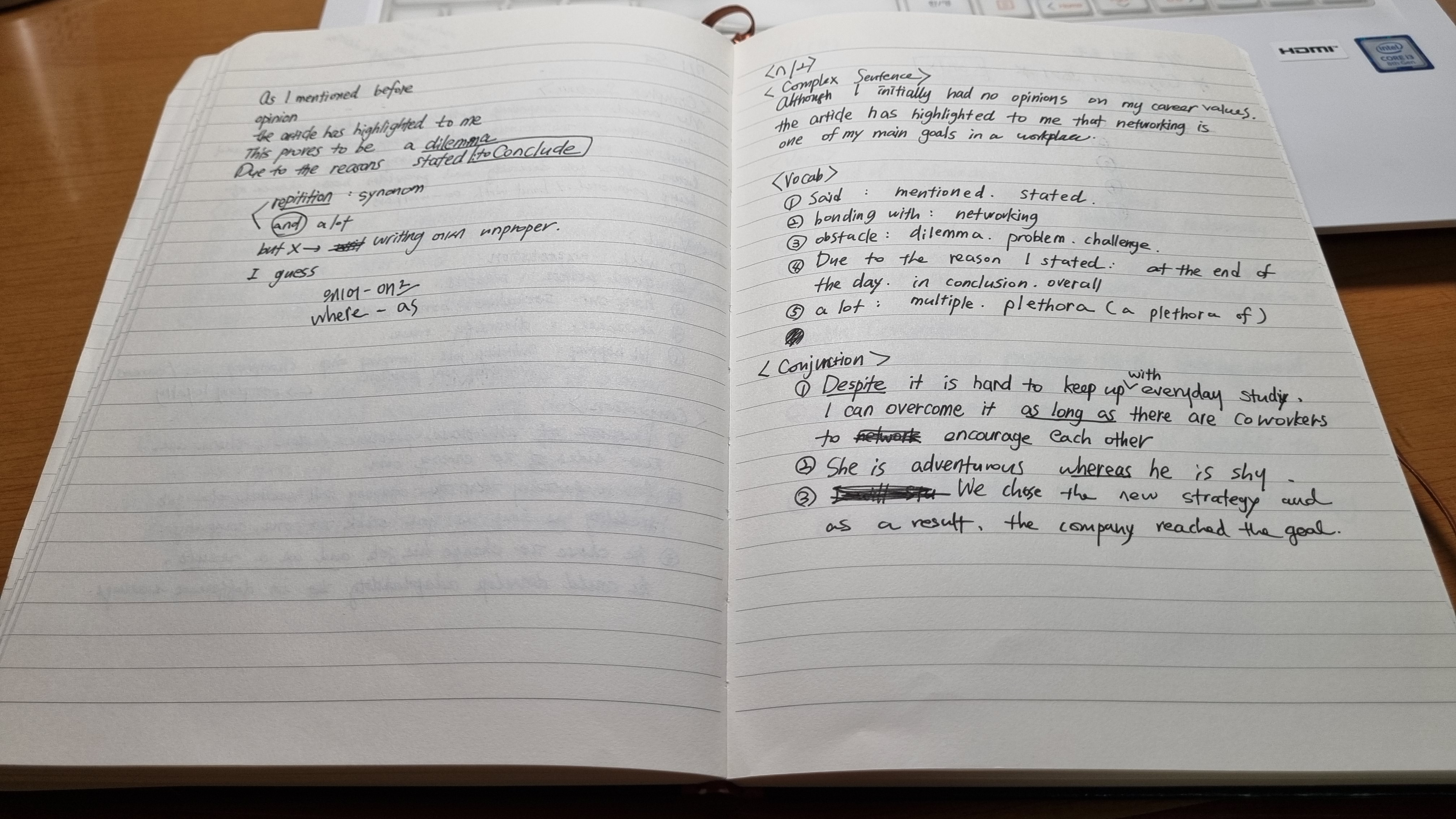 그래서 교재 질문에 대한 답을 생각할 때, 복문을 만드는 Conjunctions(접속사)를 뭘 쓸지 생각을 해보고, 고급 어휘들을 미리 찾아서 메모를 해두었습니다.
