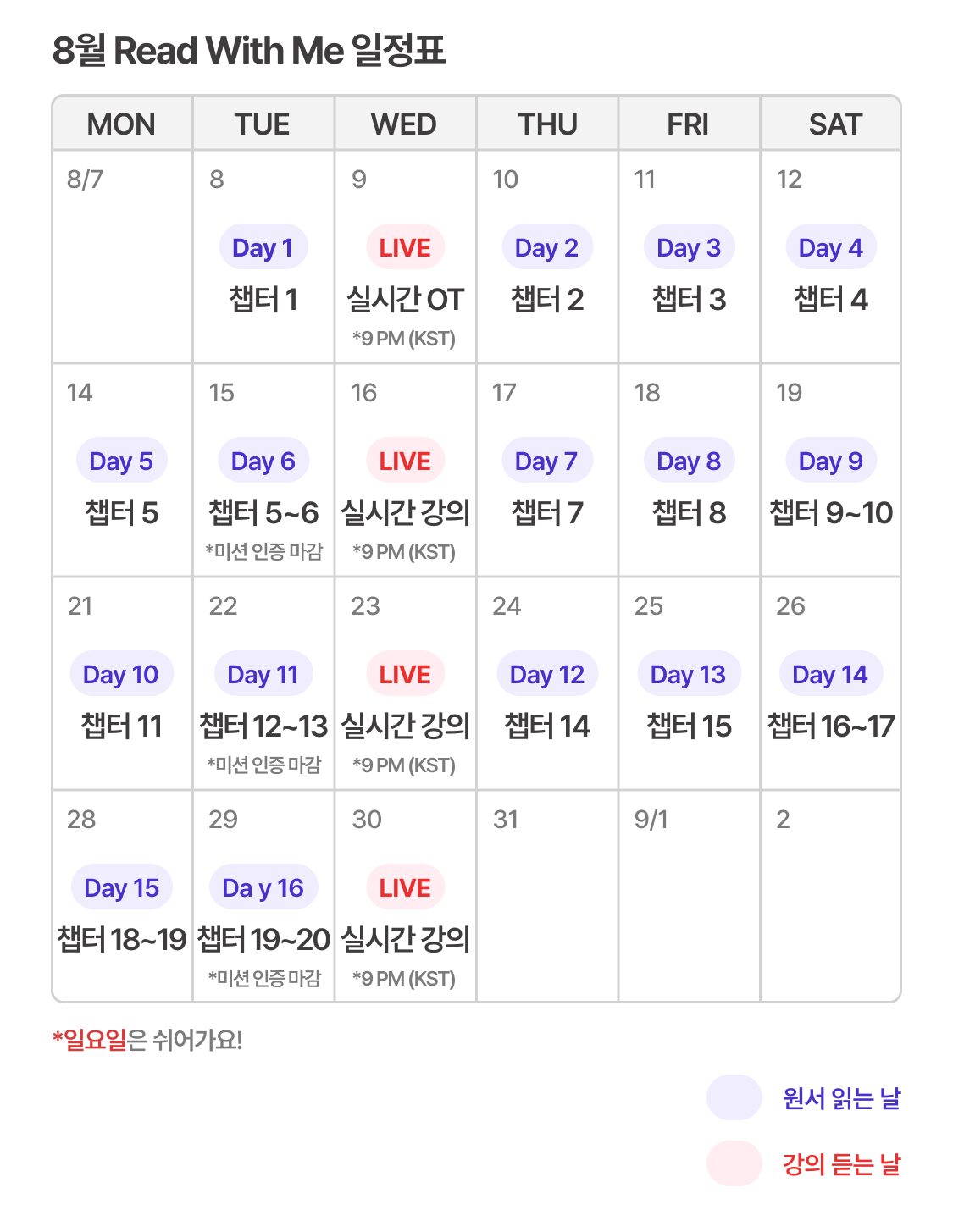 - 매주 1회 선생님과 라이브 수업(매 챕터별 요약, 주요 문단 같이 읽기, 미션 인증 질문 정답)